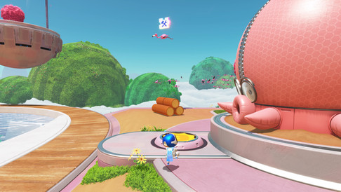 Una volta superato il vuoto, vi ritroverete su una grande piattaforma. Sulla sinistra potrete sfruttare un trampolino per lanciarvi ancora più in alto, verso il bot intrappolato sull'albero mostrato nell'immagine.